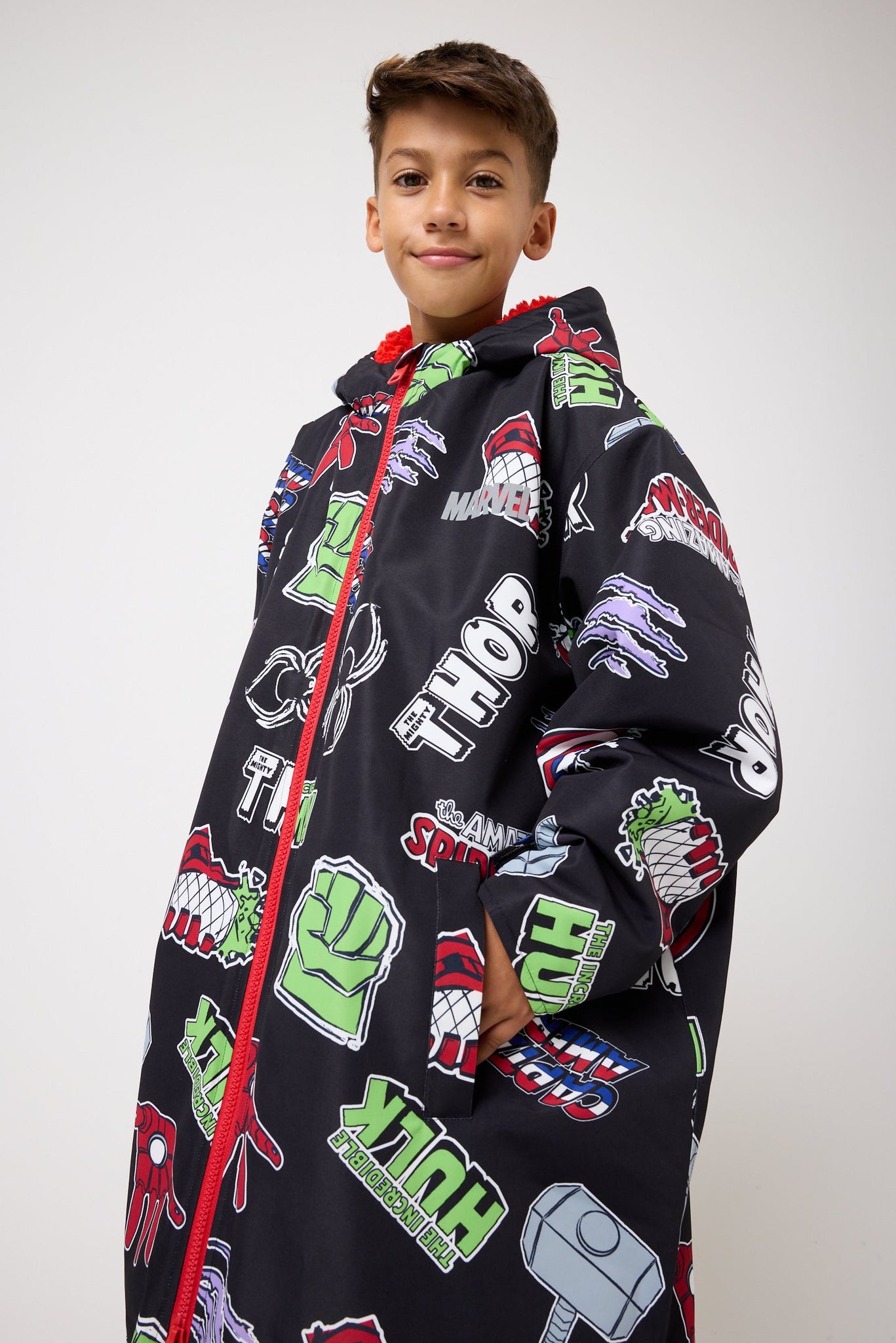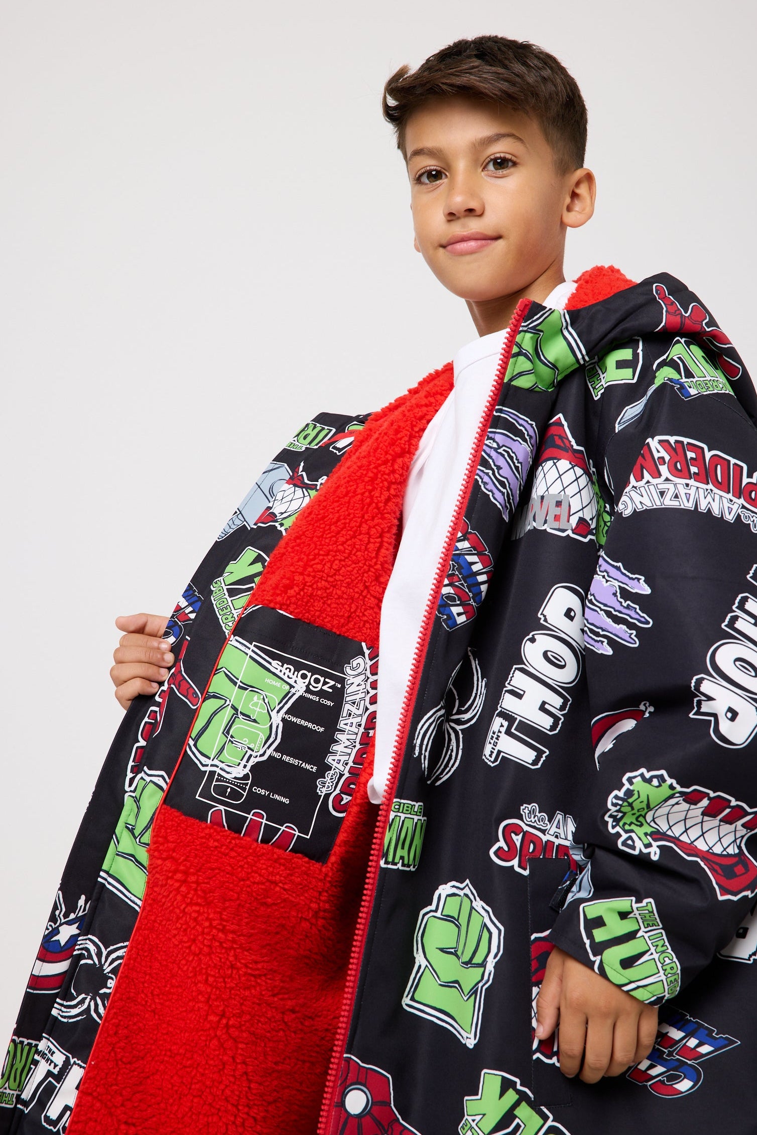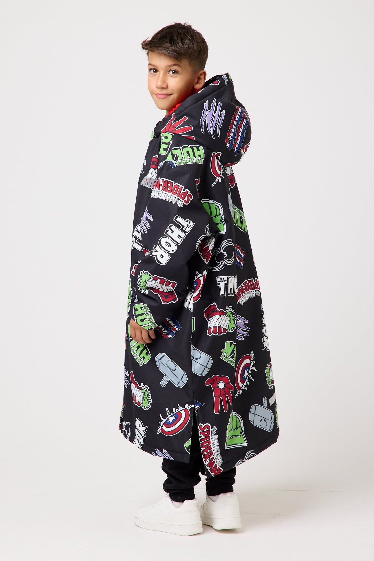 From post-training chills to wet football mornings and weekend adventures, this robe is made for boys who dream big. The deep black base is packed with iconic Marvel logos and emblems from fan favourites like Thor, The Hulk, Captain America and Spider-Man, while the vibrant red borg lining keeps them warm and cosy in true superhero fashion. It’s the perfect layer for little heroes in between saving the world.