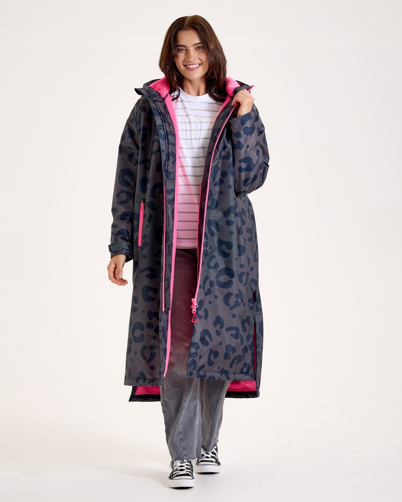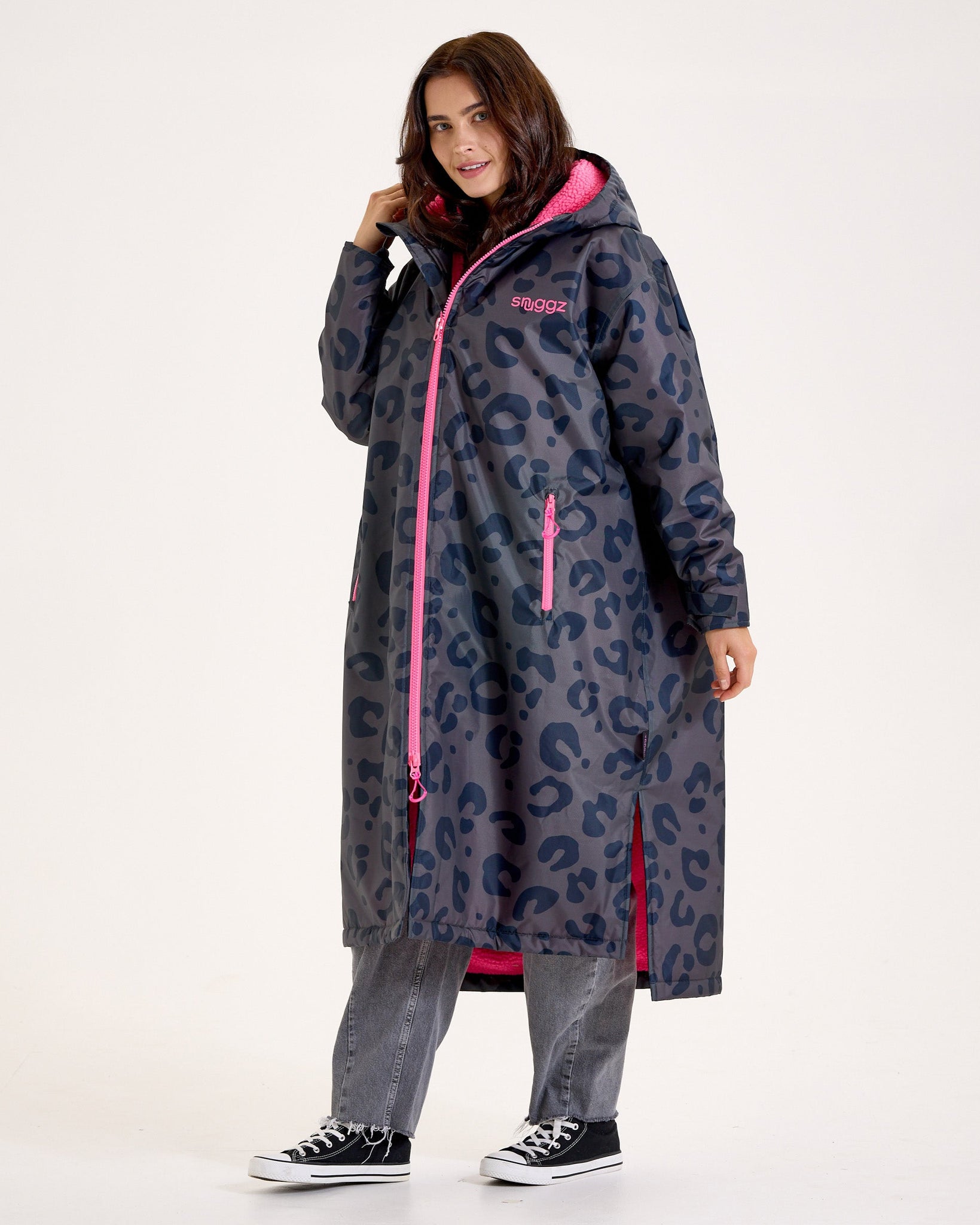 Showerproof and wind-resistant, it’s lined with pink, soft premium borg to keep you snug while you change or simply stay cosy in colder weather. With an oversized fit, full-length two-way zip, and protective high-neck hood, it’s built to keep the elements out and the warmth in. Offers reliable water-resistant protection, ideal for light to moderate rain. Perfect for everyday wear or short outdoor outings. Not designed for heavy downpours or extended exposure to rain.